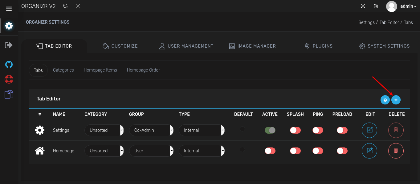 You will need to create multiple tabs with the information below. These are merely a suggestion and examples to get you up and going. Any changes made, won't be reflected until Organizr is reloaded. You can also drag and drop to change the order of the apps (don't forget to reload)