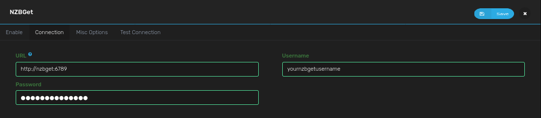 For "Username" / "Password": fill in your NZBGet login (see [NZBGet|Install: NZBGet#2-setup])