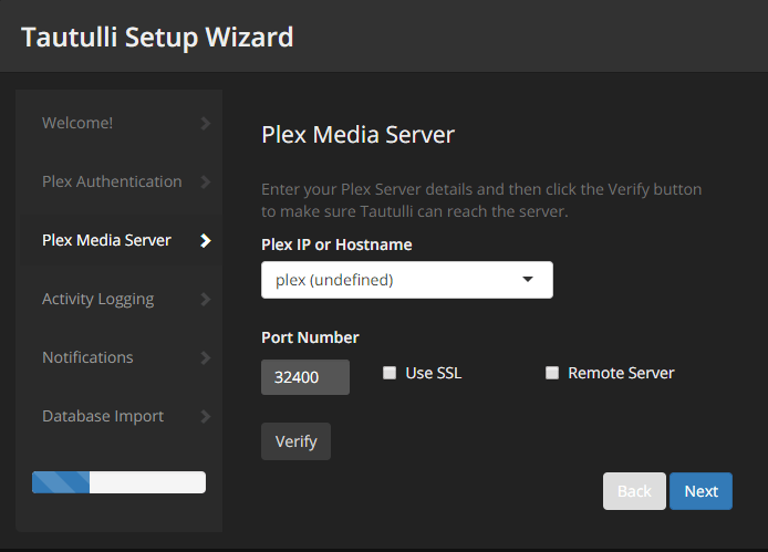 1. First time you go to the Tautulli site, you will be presented with the "Tautulli Setup Wizard". Click Next.