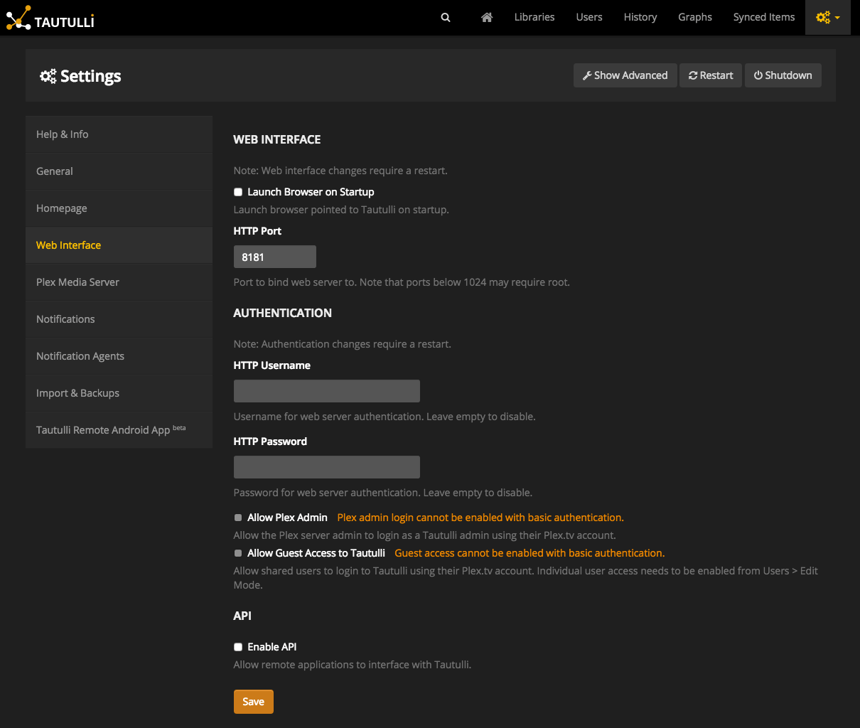 2. Click "Web Interface" on the left. Fill in "HTTP Username" and "HTTP Password (this will be the login for your Tautulli site), but don't click Save yet.